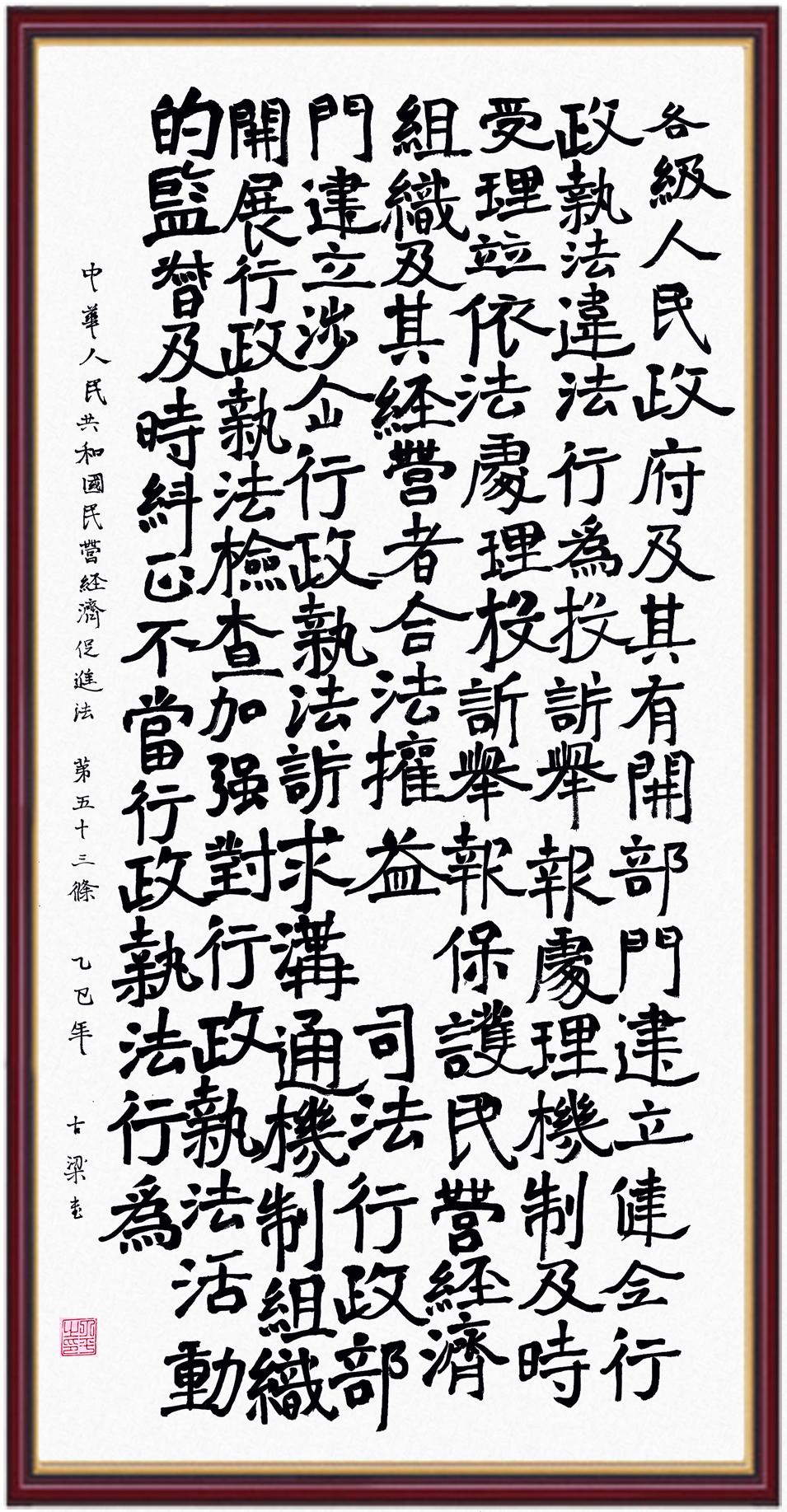 《中華人民共和國民營經(jīng)濟(jì)促進(jìn)法》自今年5月20日起施行。作為我國首部專門關(guān)于民營經(jīng)濟(jì)發(fā)展的基礎(chǔ)性法律,民營經(jīng)濟(jì)促進(jìn)法將支持和保障民營經(jīng)濟(jì)發(fā)展的法律制度融入中國特色社會(huì)主義法律體系,具有重大的法治意義,為促進(jìn)民營經(jīng)濟(jì)持續(xù)、健康、高質(zhì)量發(fā)展提供了堅(jiān)實(shí)的法治保障。為更好地學(xué)習(xí)、宣傳、貫徹這部法律,法治日?qǐng)?bào)社聯(lián)合司法部普法與依法治理局,開展“‘書·法’系列活動(dòng)之書寫《中華人民共和國民營經(jīng)濟(jì)促進(jìn)法》”活動(dòng)。