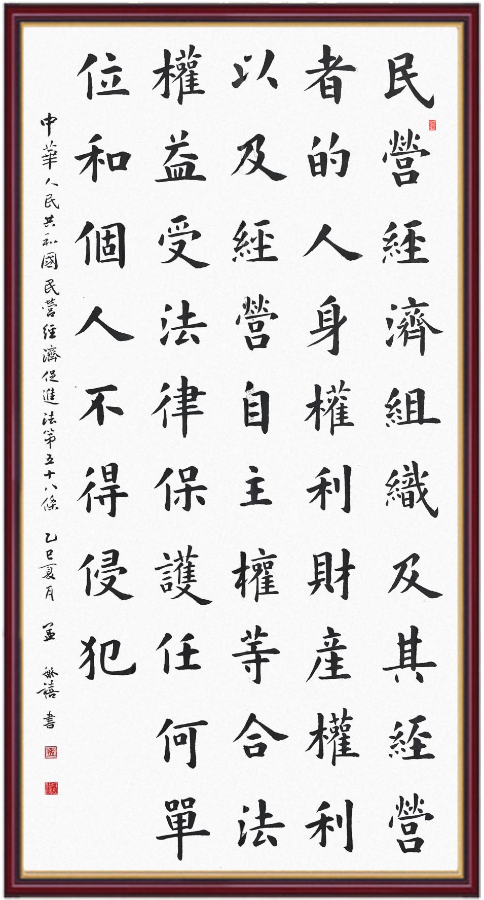 《中華人民共和國民營經(jīng)濟(jì)促進(jìn)法》自今年5月20日起施行。作為我國首部專門關(guān)于民營經(jīng)濟(jì)發(fā)展的基礎(chǔ)性法律,民營經(jīng)濟(jì)促進(jìn)法將支持和保障民營經(jīng)濟(jì)發(fā)展的法律制度融入中國特色社會主義法律體系,具有重大的法治意義,為促進(jìn)民營經(jīng)濟(jì)持續(xù)、健康、高質(zhì)量發(fā)展提供了堅實的法治保障。為更好地學(xué)習(xí)、宣傳、貫徹這部法律,法治日報社聯(lián)合司法部普法與依法治理局,開展“‘書·法’系列活動之書寫《中華人民共和國民營經(jīng)濟(jì)促進(jìn)法》”活動。