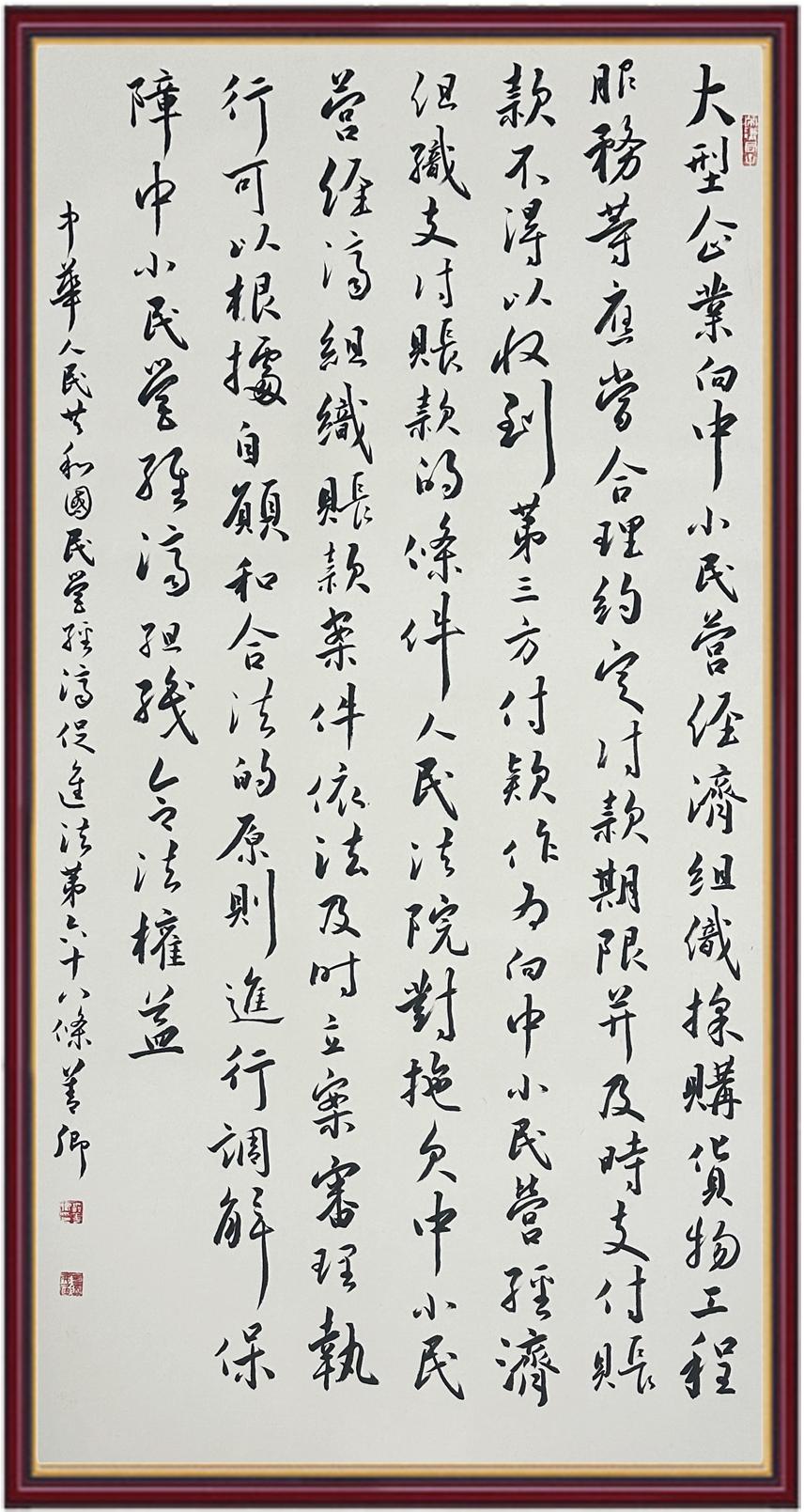 《中華人民共和國民營經(jīng)濟(jì)促進(jìn)法》自今年5月20日起施行。作為我國首部專門關(guān)于民營經(jīng)濟(jì)發(fā)展的基礎(chǔ)性法律,民營經(jīng)濟(jì)促進(jìn)法將支持和保障民營經(jīng)濟(jì)發(fā)展的法律制度融入中國特色社會主義法律體系,具有重大的法治意義,為促進(jìn)民營經(jīng)濟(jì)持續(xù)、健康、高質(zhì)量發(fā)展提供了堅(jiān)實(shí)的法治保障。為更好地學(xué)習(xí)、宣傳、貫徹這部法律,法治日報社聯(lián)合司法部普法與依法治理局,開展“‘書·法’系列活動之書寫《中華人民共和國民營經(jīng)濟(jì)促進(jìn)法》”活動。