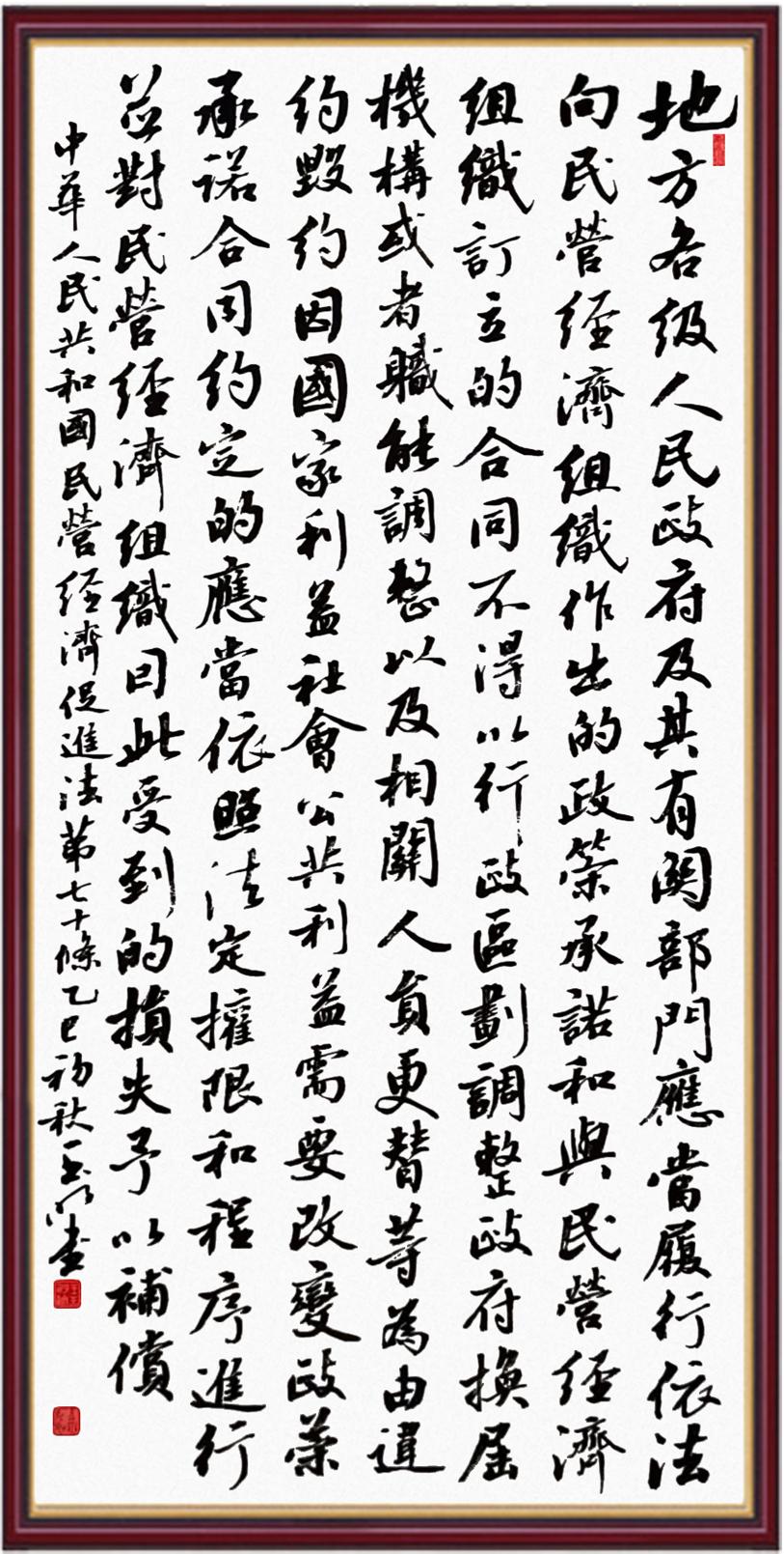 《中華人民共和國(guó)民營(yíng)經(jīng)濟(jì)促進(jìn)法》自今年5月20日起施行。作為我國(guó)首部專門關(guān)于民營(yíng)經(jīng)濟(jì)發(fā)展的基礎(chǔ)性法律,民營(yíng)經(jīng)濟(jì)促進(jìn)法將支持和保障民營(yíng)經(jīng)濟(jì)發(fā)展的法律制度融入中國(guó)特色社會(huì)主義法律體系,具有重大的法治意義,為促進(jìn)民營(yíng)經(jīng)濟(jì)持續(xù)、健康、高質(zhì)量發(fā)展提供了堅(jiān)實(shí)的法治保障。為更好地學(xué)習(xí)、宣傳、貫徹這部法律,法治日?qǐng)?bào)社聯(lián)合司法部普法與依法治理局,開(kāi)展“‘書·法’系列活動(dòng)之書寫《中華人民共和國(guó)民營(yíng)經(jīng)濟(jì)促進(jìn)法》”活動(dòng)。