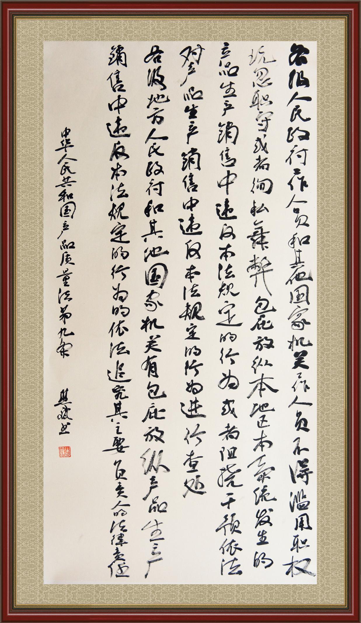 《中華人民共和國(guó)產(chǎn)品質(zhì)量法》自1993年9月1日起開始施行,先后進(jìn)行三次修正。作為產(chǎn)品質(zhì)量領(lǐng)域的基本法律,產(chǎn)品質(zhì)量法對(duì)規(guī)范產(chǎn)品質(zhì)量管理、維護(hù)消費(fèi)者合法權(quán)益、促進(jìn)經(jīng)濟(jì)社會(huì)發(fā)展具有重要意義。為更好地學(xué)習(xí)、宣傳、貫徹這部法律,在國(guó)家市場(chǎng)監(jiān)督管理總局法規(guī)司的支持下,法治日?qǐng)?bào)社開展了“‘書·法’系列活動(dòng)之書寫《中華人民共和國(guó)產(chǎn)品質(zhì)量法》”活動(dòng)。