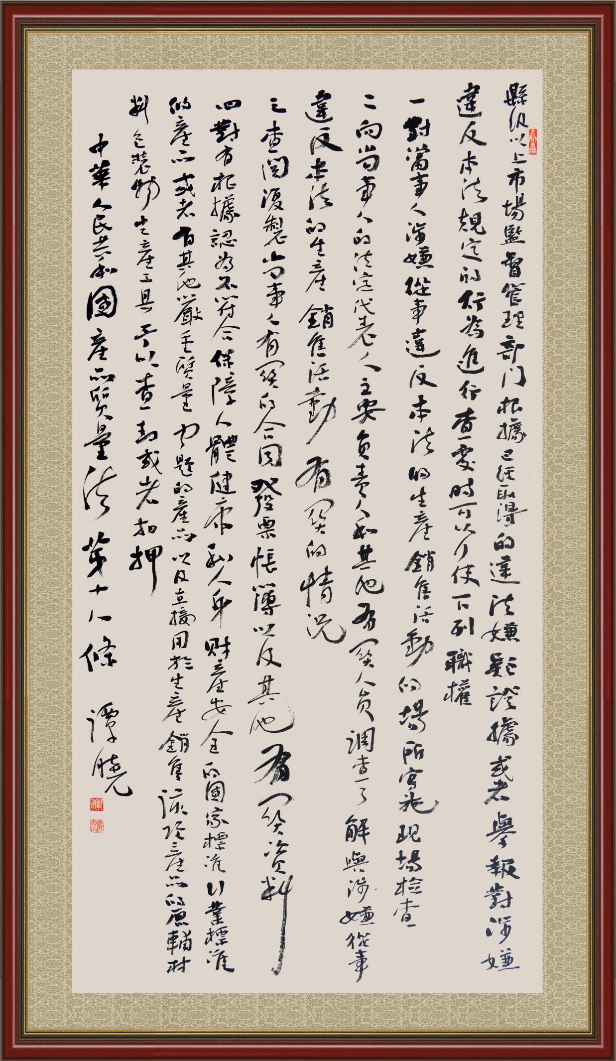 《中華人民共和國產(chǎn)品質量法》自1993年9月1日起開始施行,先后進行三次修正。作為產(chǎn)品質量領域的基本法律,產(chǎn)品質量法對規(guī)范產(chǎn)品質量管理、維護消費者合法權益、促進經(jīng)濟社會發(fā)展具有重要意義。為更好地學習、宣傳、貫徹這部法律,在國家市場監(jiān)督管理總局法規(guī)司的支持下,法治日報社開展了“‘書·法’系列活動之書寫《中華人民共和國產(chǎn)品質量法》”活動。