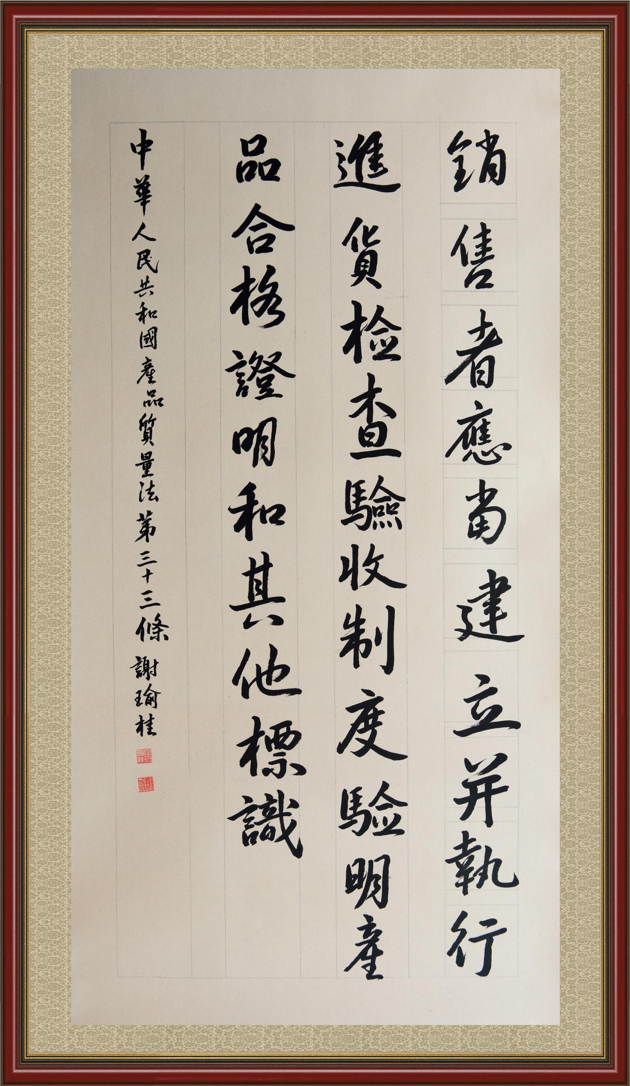 《中華人民共和國產(chǎn)品質(zhì)量法》自1993年9月1日起開始施行,先后進行三次修正。作為產(chǎn)品質(zhì)量領(lǐng)域的基本法律,產(chǎn)品質(zhì)量法對規(guī)范產(chǎn)品質(zhì)量管理、維護消費者合法權(quán)益、促進經(jīng)濟社會發(fā)展具有重要意義。為更好地學(xué)習(xí)、宣傳、貫徹這部法律,在國家市場監(jiān)督管理總局法規(guī)司的支持下,法治日報社開展了“‘書·法’系列活動之書寫《中華人民共和國產(chǎn)品質(zhì)量法》”活動。