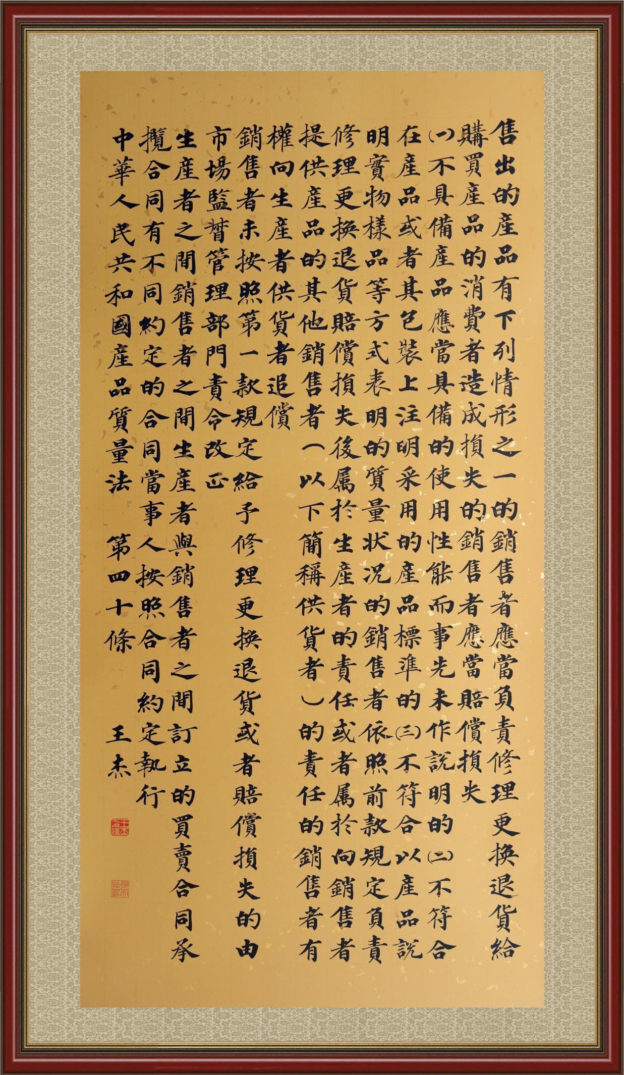 《中華人民共和國產(chǎn)品質(zhì)量法》自1993年9月1日起開始施行,先后進(jìn)行三次修正。作為產(chǎn)品質(zhì)量領(lǐng)域的基本法律,產(chǎn)品質(zhì)量法對規(guī)范產(chǎn)品質(zhì)量管理、維護(hù)消費(fèi)者合法權(quán)益、促進(jìn)經(jīng)濟(jì)社會發(fā)展具有重要意義。為更好地學(xué)習(xí)、宣傳、貫徹這部法律,在國家市場監(jiān)督管理總局法規(guī)司的支持下,法治日報(bào)社開展了“‘書·法’系列活動(dòng)之書寫《中華人民共和國產(chǎn)品質(zhì)量法》”活動(dòng)。