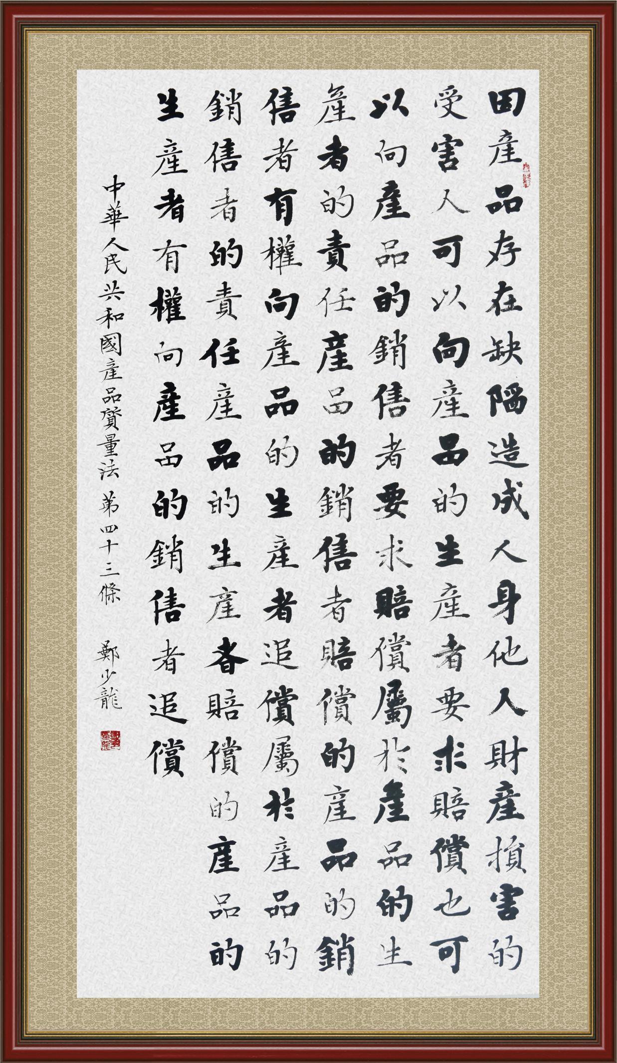《中華人民共和國產(chǎn)品質(zhì)量法》自1993年9月1日起開始施行,先后進(jìn)行三次修正。作為產(chǎn)品質(zhì)量領(lǐng)域的基本法律,產(chǎn)品質(zhì)量法對規(guī)范產(chǎn)品質(zhì)量管理、維護(hù)消費者合法權(quán)益、促進(jìn)經(jīng)濟(jì)社會發(fā)展具有重要意義。為更好地學(xué)習(xí)、宣傳、貫徹這部法律,在國家市場監(jiān)督管理總局法規(guī)司的支持下,法治日報社開展了“‘書·法’系列活動之書寫《中華人民共和國產(chǎn)品質(zhì)量法》”活動。