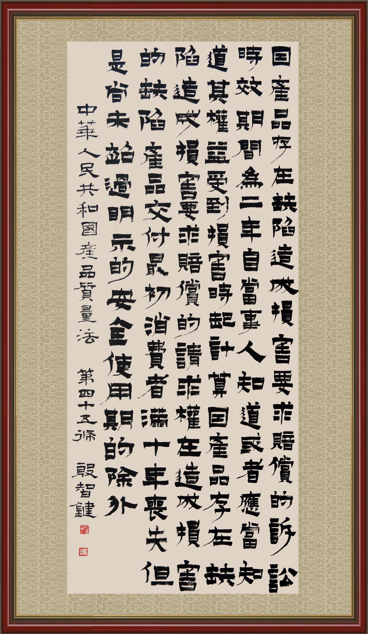 《中華人民共和國(guó)產(chǎn)品質(zhì)量法》自1993年9月1日起開(kāi)始施行,先后進(jìn)行三次修正。作為產(chǎn)品質(zhì)量領(lǐng)域的基本法律,產(chǎn)品質(zhì)量法對(duì)規(guī)范產(chǎn)品質(zhì)量管理、維護(hù)消費(fèi)者合法權(quán)益、促進(jìn)經(jīng)濟(jì)社會(huì)發(fā)展具有重要意義。為更好地學(xué)習(xí)、宣傳、貫徹這部法律,在國(guó)家市場(chǎng)監(jiān)督管理總局法規(guī)司的支持下,法治日?qǐng)?bào)社開(kāi)展了“‘書(shū)·法’系列活動(dòng)之書(shū)寫(xiě)《中華人民共和國(guó)產(chǎn)品質(zhì)量法》”活動(dòng)。