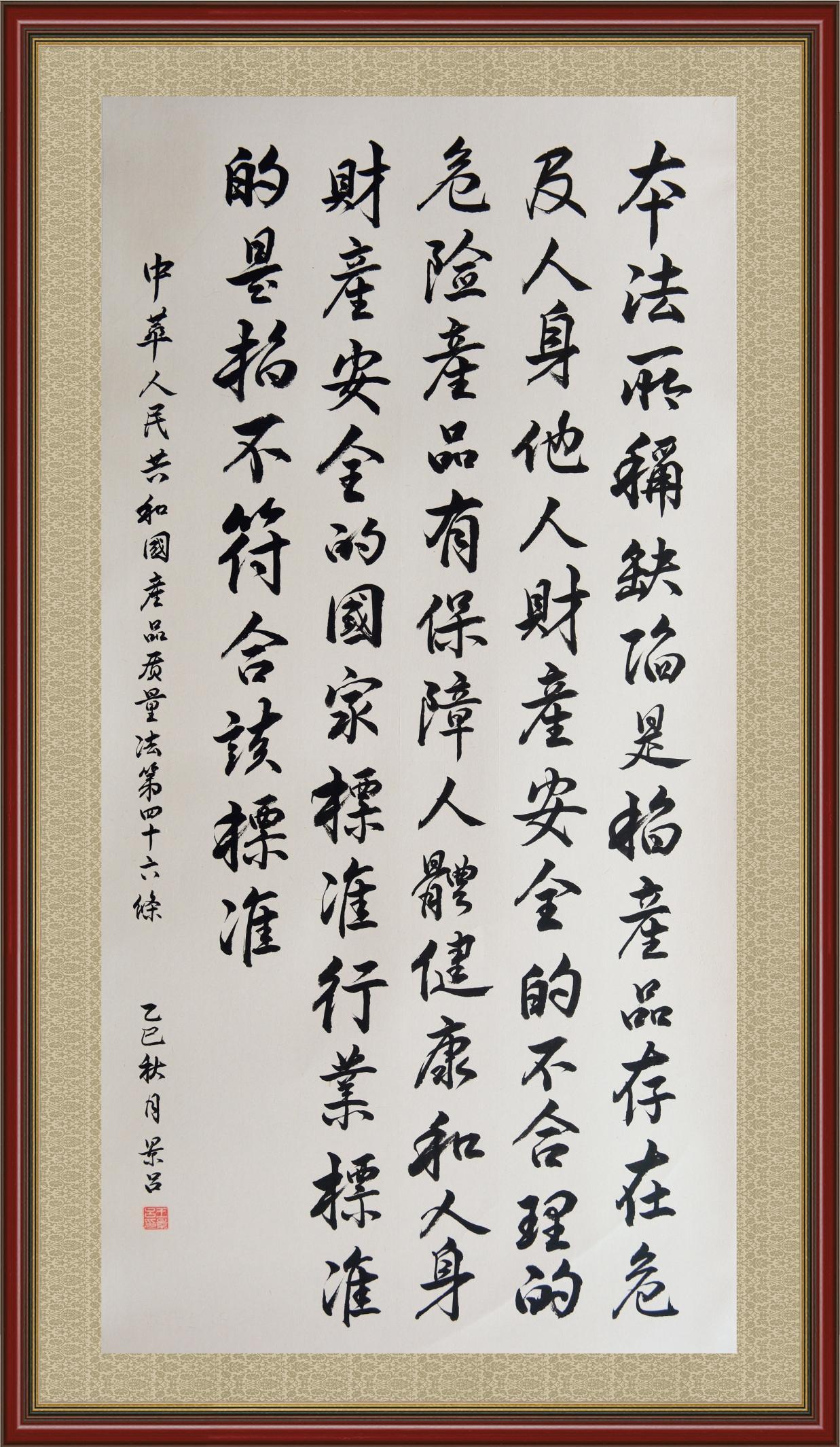 《中華人民共和國產(chǎn)品質(zhì)量法》自1993年9月1日起開始施行,先后進行三次修正。作為產(chǎn)品質(zhì)量領域的基本法律,產(chǎn)品質(zhì)量法對規(guī)范產(chǎn)品質(zhì)量管理、維護消費者合法權益、促進經(jīng)濟社會發(fā)展具有重要意義。為更好地學習、宣傳、貫徹這部法律,在國家市場監(jiān)督管理總局法規(guī)司的支持下,法治日報社開展了“‘書·法’系列活動之書寫《中華人民共和國產(chǎn)品質(zhì)量法》”活動。