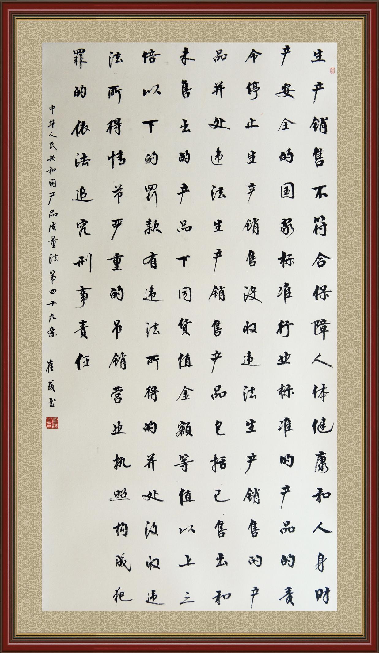《中華人民共和國產(chǎn)品質(zhì)量法》自1993年9月1日起開始施行,先后進行三次修正。作為產(chǎn)品質(zhì)量領(lǐng)域的基本法律,產(chǎn)品質(zhì)量法對規(guī)范產(chǎn)品質(zhì)量管理、維護消費者合法權(quán)益、促進經(jīng)濟社會發(fā)展具有重要意義。為更好地學(xué)習(xí)、宣傳、貫徹這部法律,在國家市場監(jiān)督管理總局法規(guī)司的支持下,法治日報社開展了“‘書·法’系列活動之書寫《中華人民共和國產(chǎn)品質(zhì)量法》”活動。