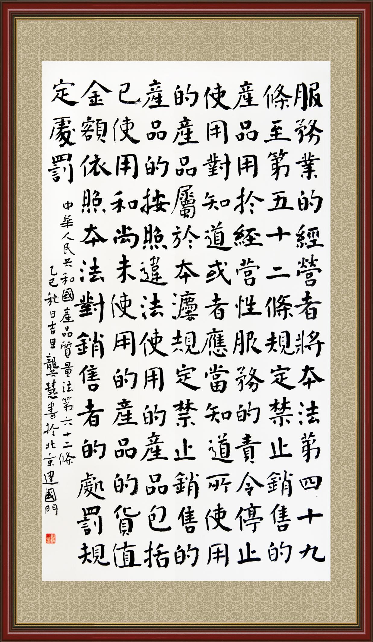 《中華人民共和國產(chǎn)品質(zhì)量法》自1993年9月1日起開始施行,先后進(jìn)行三次修正。作為產(chǎn)品質(zhì)量領(lǐng)域的基本法律,產(chǎn)品質(zhì)量法對規(guī)范產(chǎn)品質(zhì)量管理、維護(hù)消費者合法權(quán)益、促進(jìn)經(jīng)濟(jì)社會發(fā)展具有重要意義。為更好地學(xué)習(xí)、宣傳、貫徹這部法律,在國家市場監(jiān)督管理總局法規(guī)司的支持下,法治日報社開展了“‘書·法’系列活動之書寫《中華人民共和國產(chǎn)品質(zhì)量法》”活動。