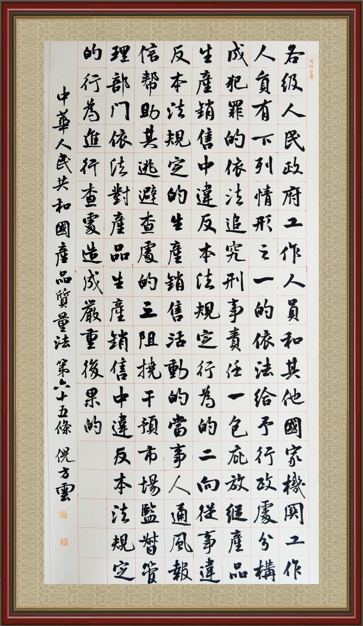 《中華人民共和國(guó)產(chǎn)品質(zhì)量法》自1993年9月1日起開(kāi)始施行,先后進(jìn)行三次修正。作為產(chǎn)品質(zhì)量領(lǐng)域的基本法律,產(chǎn)品質(zhì)量法對(duì)規(guī)范產(chǎn)品質(zhì)量管理、維護(hù)消費(fèi)者合法權(quán)益、促進(jìn)經(jīng)濟(jì)社會(huì)發(fā)展具有重要意義。為更好地學(xué)習(xí)、宣傳、貫徹這部法律,在國(guó)家市場(chǎng)監(jiān)督管理總局法規(guī)司的支持下,法治日?qǐng)?bào)社開(kāi)展了“‘書(shū)·法’系列活動(dòng)之書(shū)寫(xiě)《中華人民共和國(guó)產(chǎn)品質(zhì)量法》”活動(dòng)。