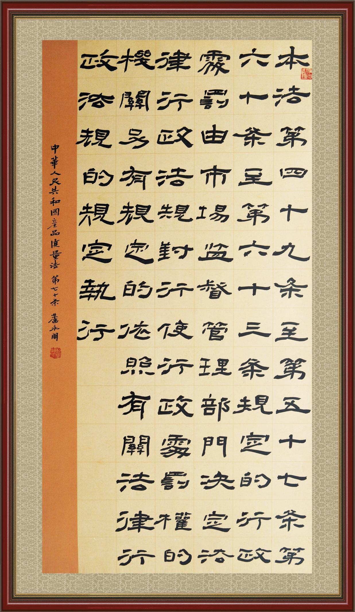 《中華人民共和國產(chǎn)品質(zhì)量法》自1993年9月1日起開始施行,先后進行三次修正。作為產(chǎn)品質(zhì)量領(lǐng)域的基本法律,產(chǎn)品質(zhì)量法對規(guī)范產(chǎn)品質(zhì)量管理、維護消費者合法權(quán)益、促進經(jīng)濟社會發(fā)展具有重要意義。為更好地學(xué)習(xí)、宣傳、貫徹這部法律,在國家市場監(jiān)督管理總局法規(guī)司的支持下,法治日報社開展了“‘書·法’系列活動之書寫《中華人民共和國產(chǎn)品質(zhì)量法》”活動。