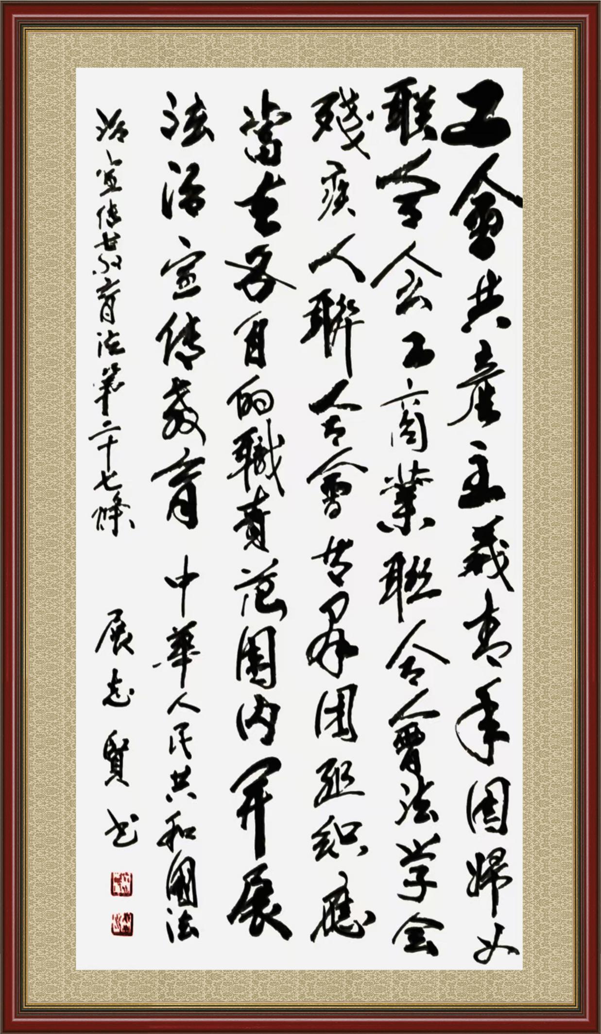 2020年7月11日,由法治日報社主辦的“書·法”系列活動正式啟動,先后書寫《中華人民共和國民法典》《中華人民共和國憲法》《中華人民共和國民營經濟促進法》等21部法律法規(guī)。