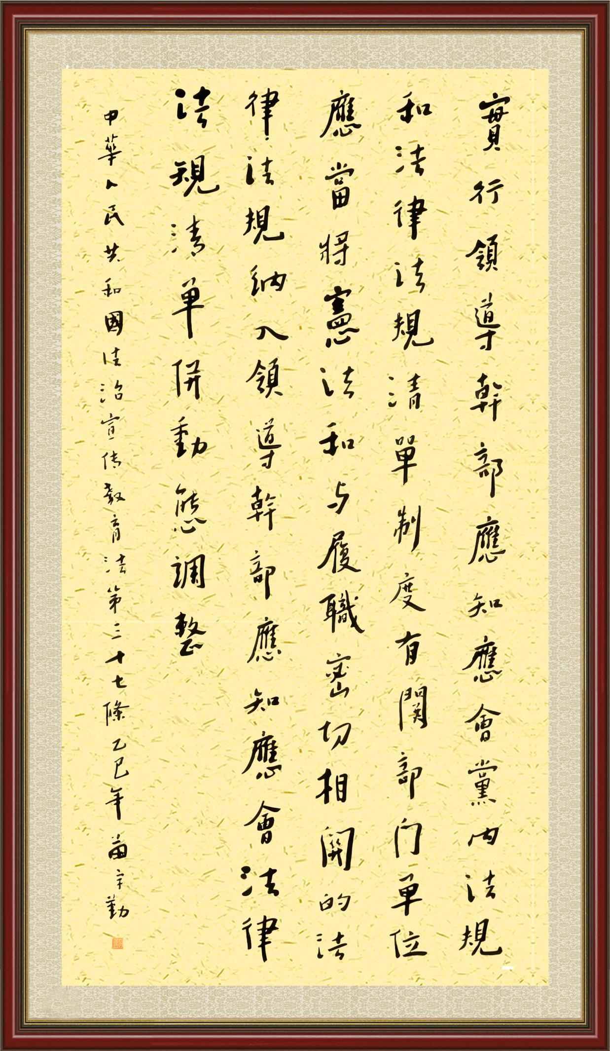 2020年7月11日,由法治日報社主辦的“書·法”系列活動正式啟動,先后書寫《中華人民共和國民法典》《中華人民共和國憲法》《中華人民共和國民營經(jīng)濟(jì)促進(jìn)法》等21部法律法規(guī)。