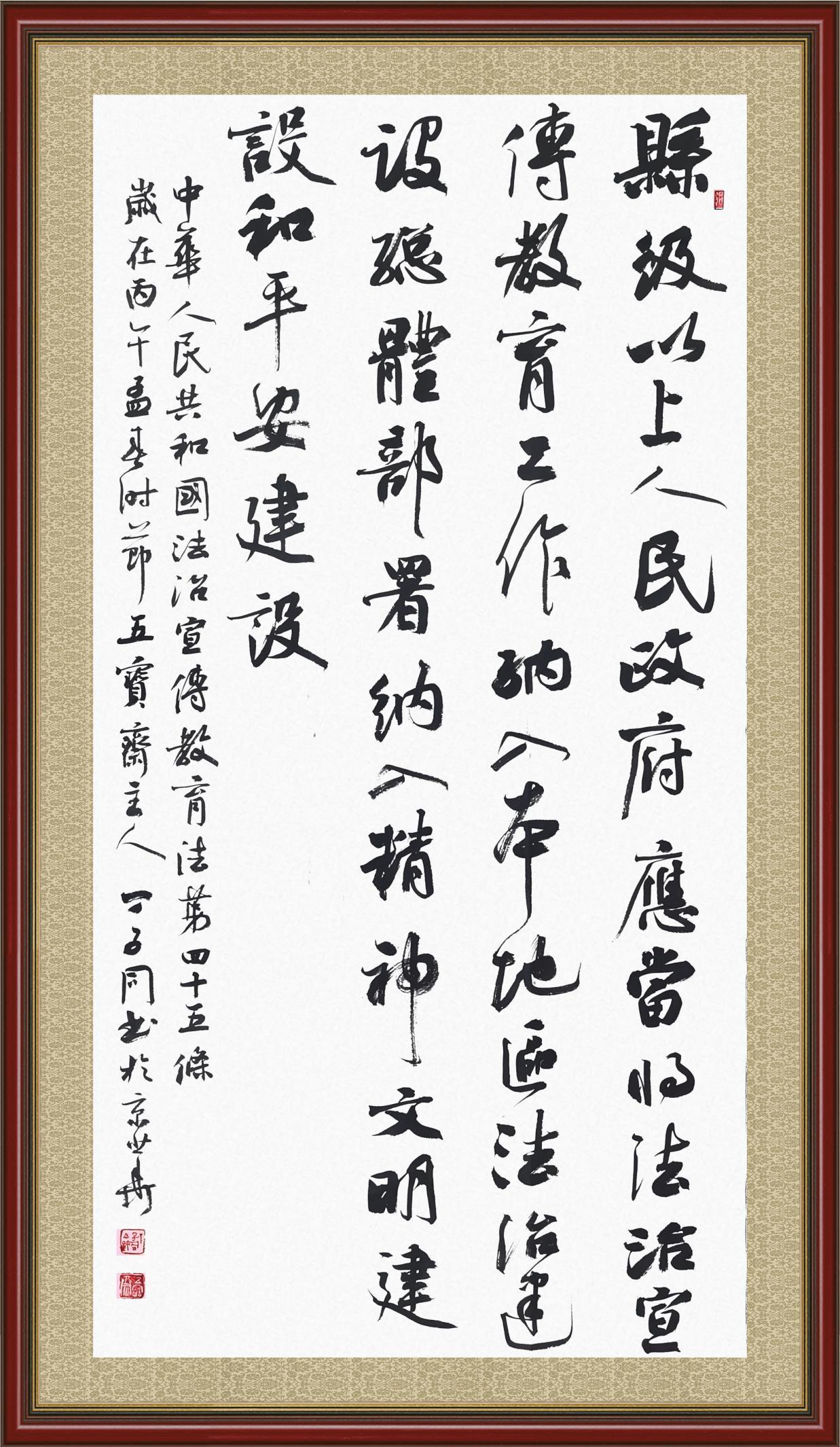 2020年7月11日,由法治日報(bào)社主辦的“書·法”系列活動(dòng)正式啟動(dòng),先后書寫《中華人民共和國民法典》《中華人民共和國憲法》《中華人民共和國民營經(jīng)濟(jì)促進(jìn)法》等21部法律法規(guī)。