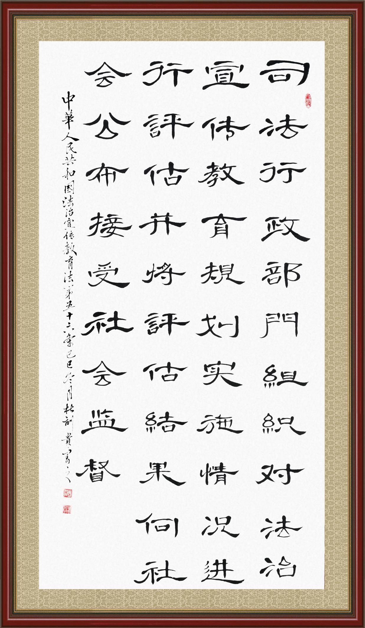 2020年7月11日,由法治日報社主辦的“書·法”系列活動正式啟動,先后書寫《中華人民共和國民法典》《中華人民共和國憲法》《中華人民共和國民營經(jīng)濟促進(jìn)法》等21部法律法規(guī)。