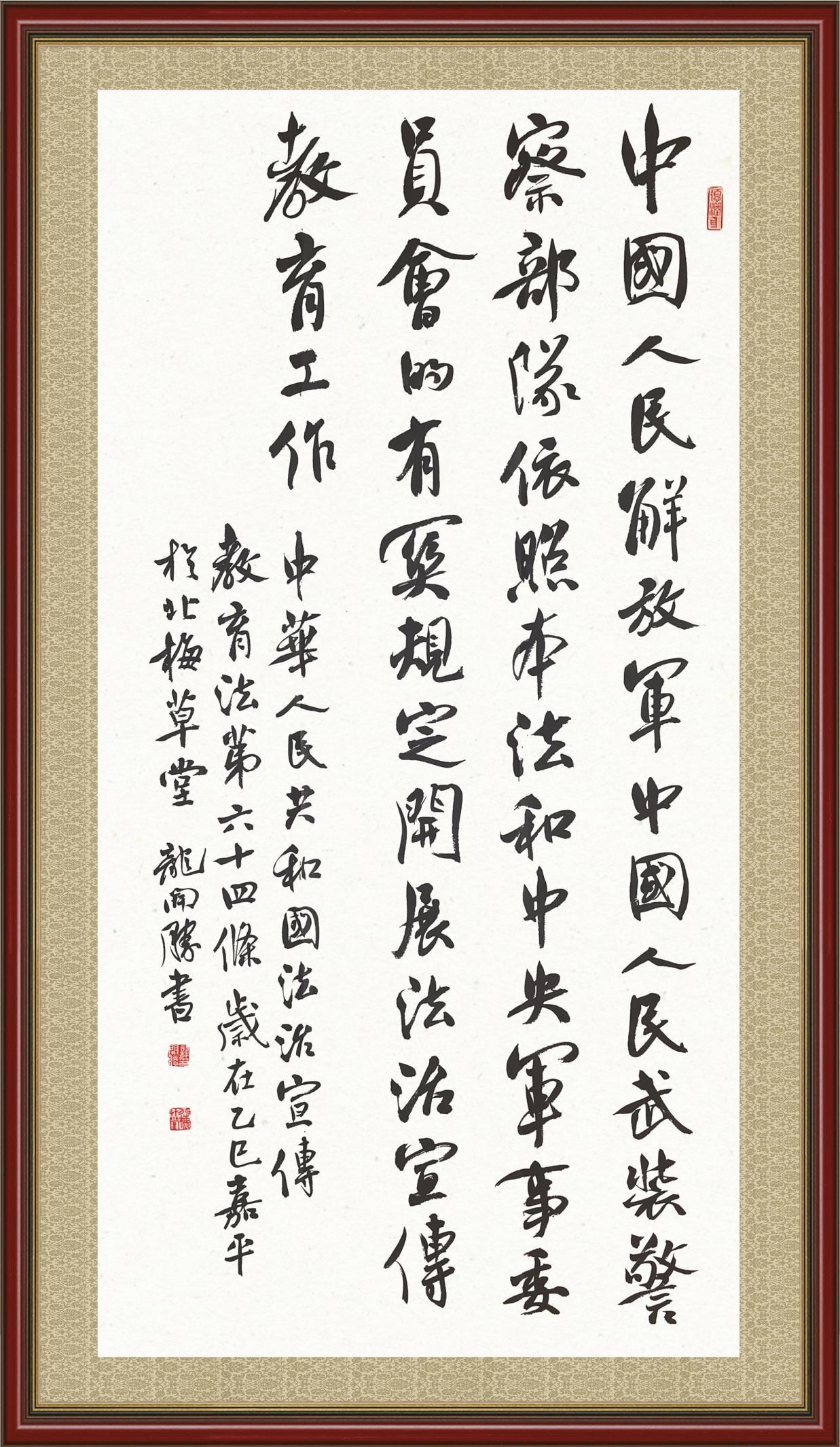 2020年7月11日,由法治日報社主辦的“書·法”系列活動正式啟動,先后書寫《中華人民共和國民法典》《中華人民共和國憲法》《中華人民共和國民營經(jīng)濟促進法》等21部法律法規(guī)。