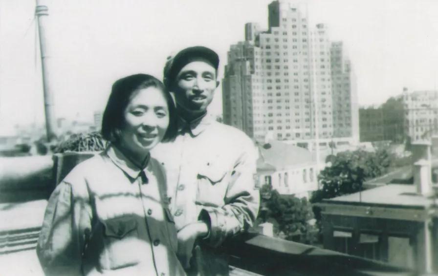 1949年5月24日,父親母親在新華社華東總分社(及上海分社)樓頂?shù)暮嫌啊?/span>