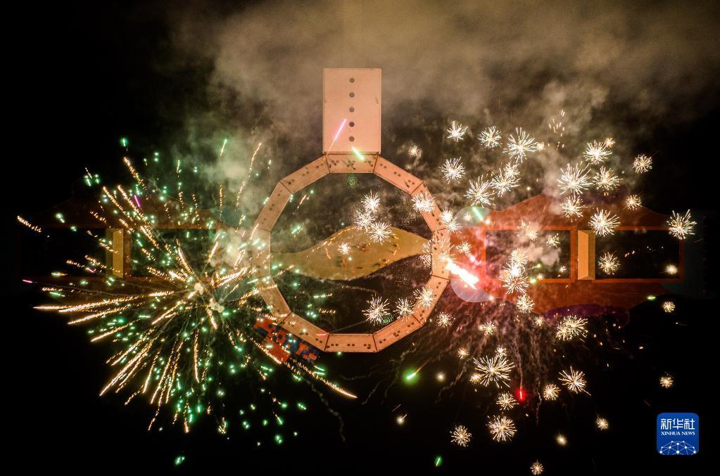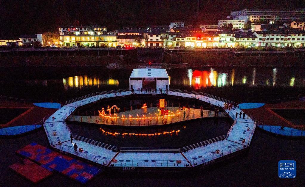 2月2日在浙江省杭州市淳安縣里商鄉(xiāng)拍攝的里商仁燈元宵表演(無人機(jī)照片)。