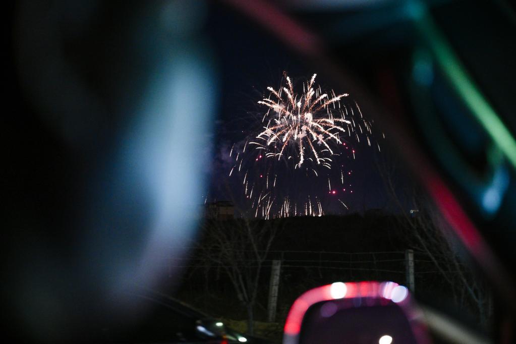2月5日,通遼市奈曼旗公安局大沁他拉派出所民警在出警時,遠處綻放的煙花。