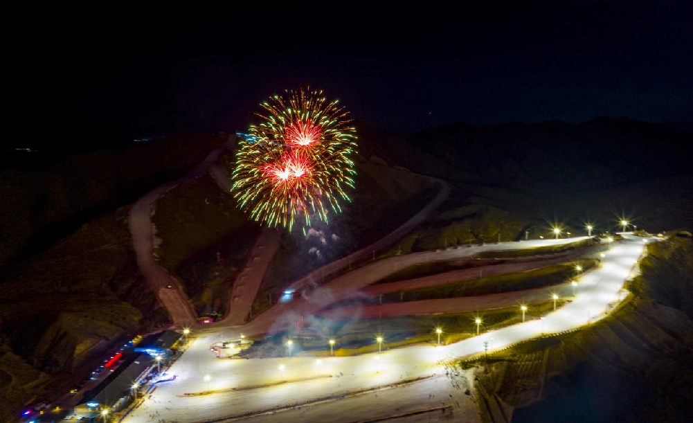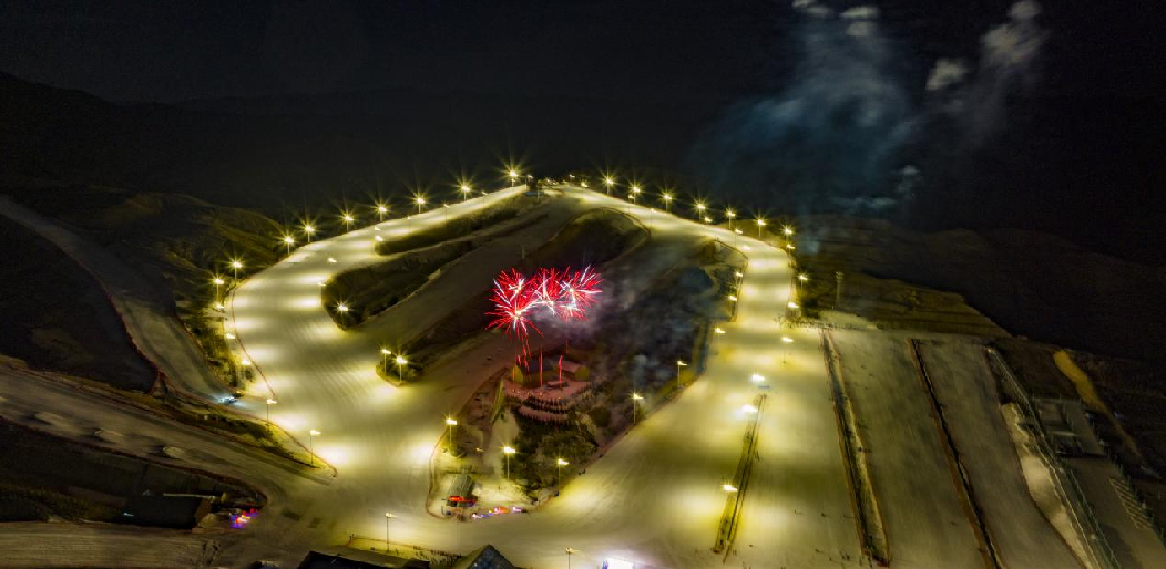 2月5日,馬鬃山滑雪場上演大型雪地?zé)熁ㄐ?,吸引了大量游客觀看。(無人機照片)新華網(wǎng)發(fā)(樂炎 攝)
