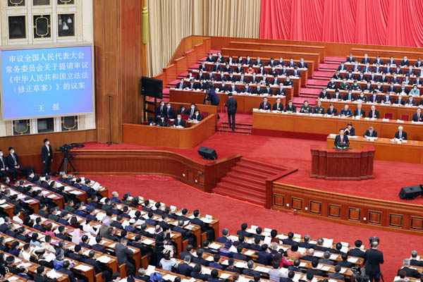 3月5日,第十三屆全國人大常委會副委員長王晨在第十四屆全國人民代表大會第一次會議上作關于《中華人民共和國立法法(修正草案)》的說明。許麟 攝