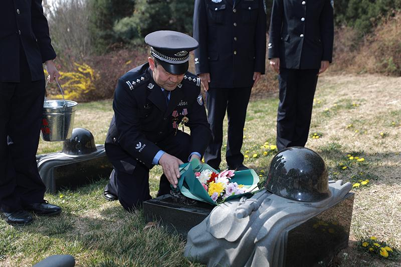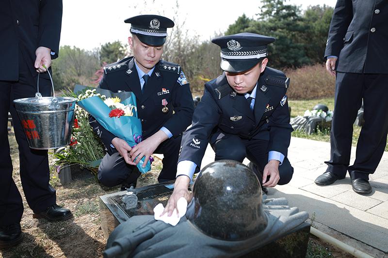 圖為公安民警代表擦拭墓碑,敬獻(xiàn)鮮花,表達(dá)對烈士的哀思。