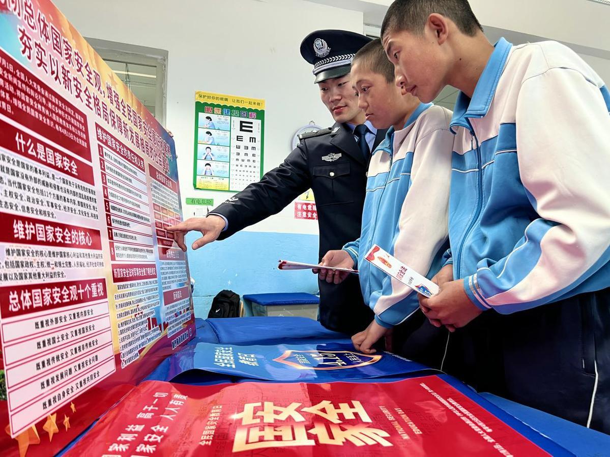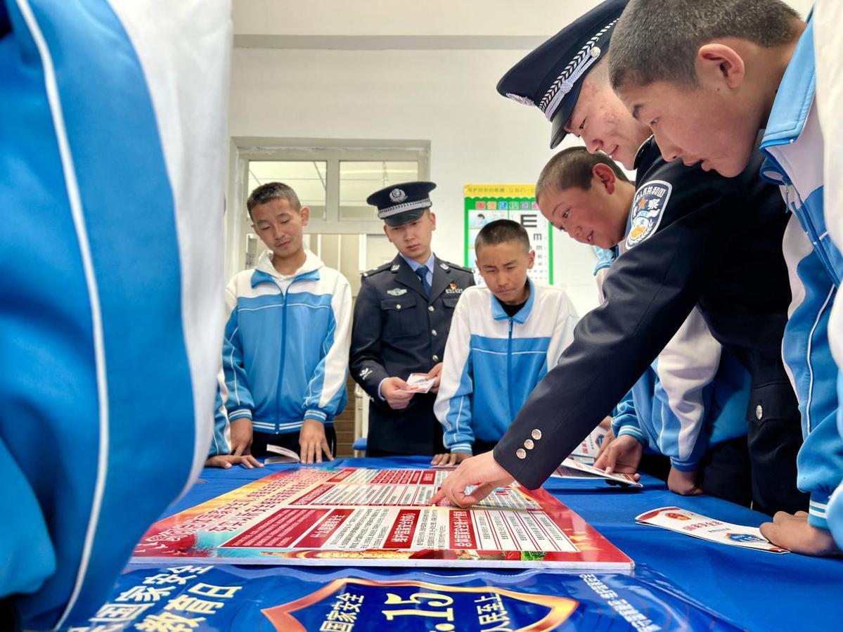 圖為2023年4月11日,民警正在利用宣傳展板與宣傳資料開展全民國家安全教育日授課。