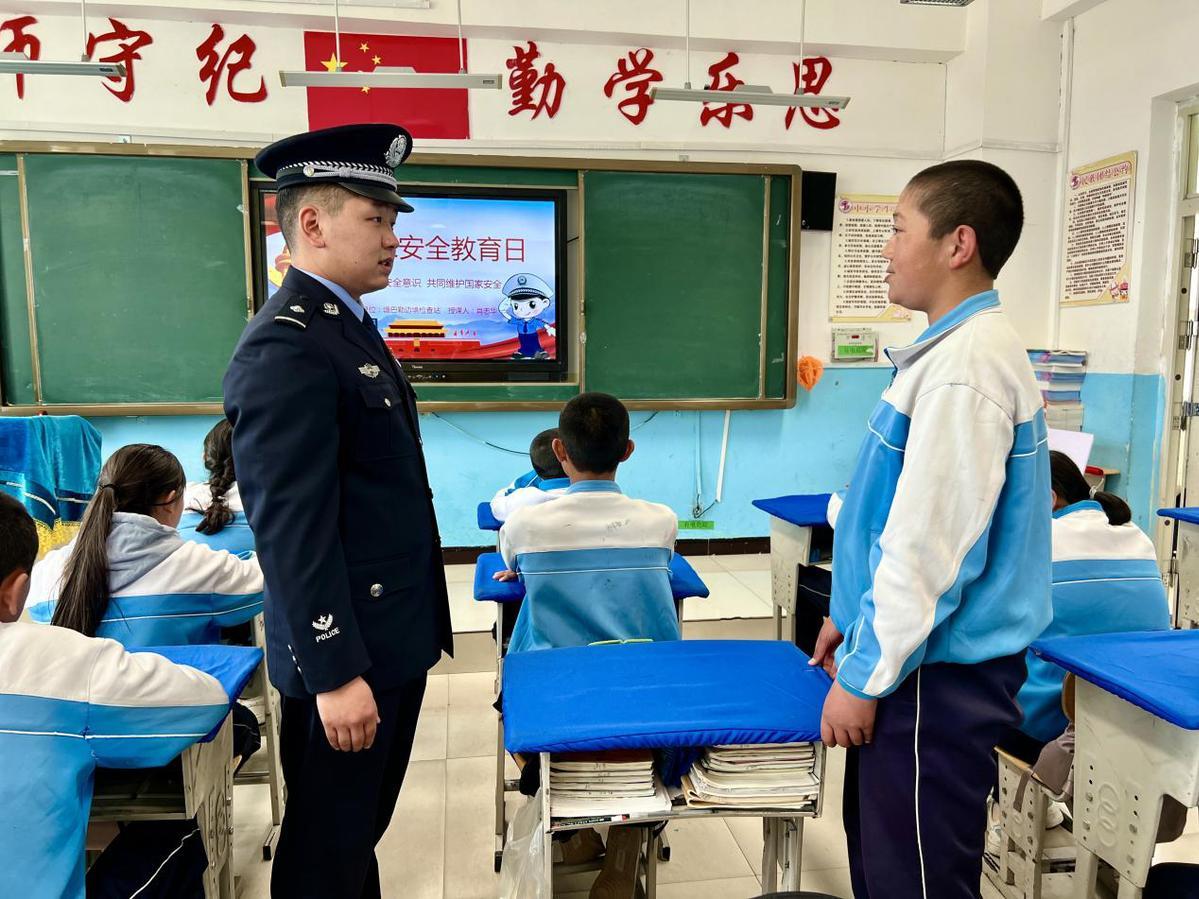 圖為2023年4月11日,民警正在向?qū)W生提問有關全民國家安全教育日的知識。