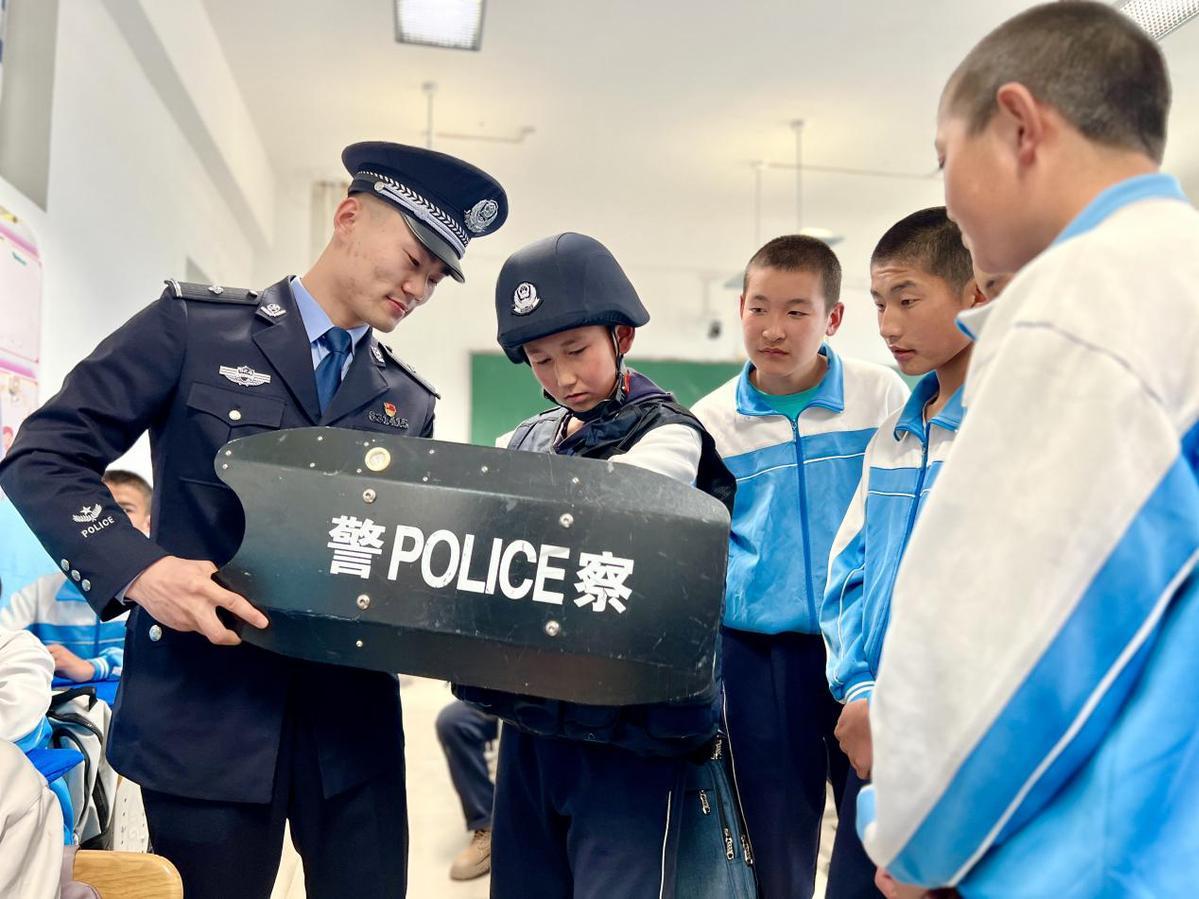 圖為2023年4月11日,民警正在向?qū)W生講解警務器材。