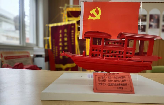 走進(jìn)朝陽里社區(qū)的和平區(qū)社區(qū)志愿服務(wù)展館,一艘紅色的小船模型靜靜地??吭谌肟谔幍臅郎?,小船的上方,懸掛著一面袖珍的黨旗。