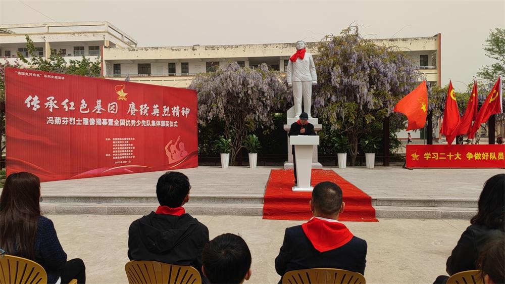 活動(dòng)現(xiàn)場(chǎng),出席儀式的幾位領(lǐng)導(dǎo)和少先隊(duì)員代表緩緩地為“雨花英烈”之一的馮菊芬烈士塑像揭幕,褪去紅布的烈士塑像在藍(lán)天白云下愈顯純潔高大、莊嚴(yán)而肅穆。