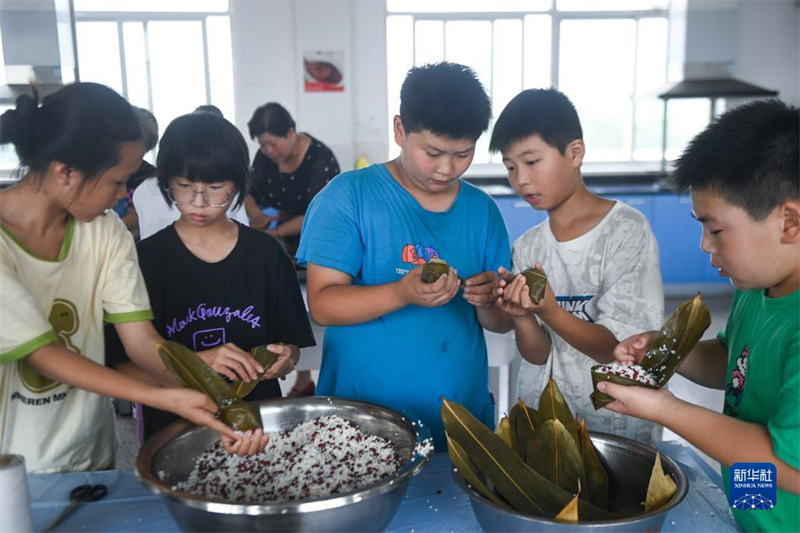 6月8日,學(xué)生們?cè)趥鹘y(tǒng)習(xí)俗課上學(xué)習(xí)包粽子。