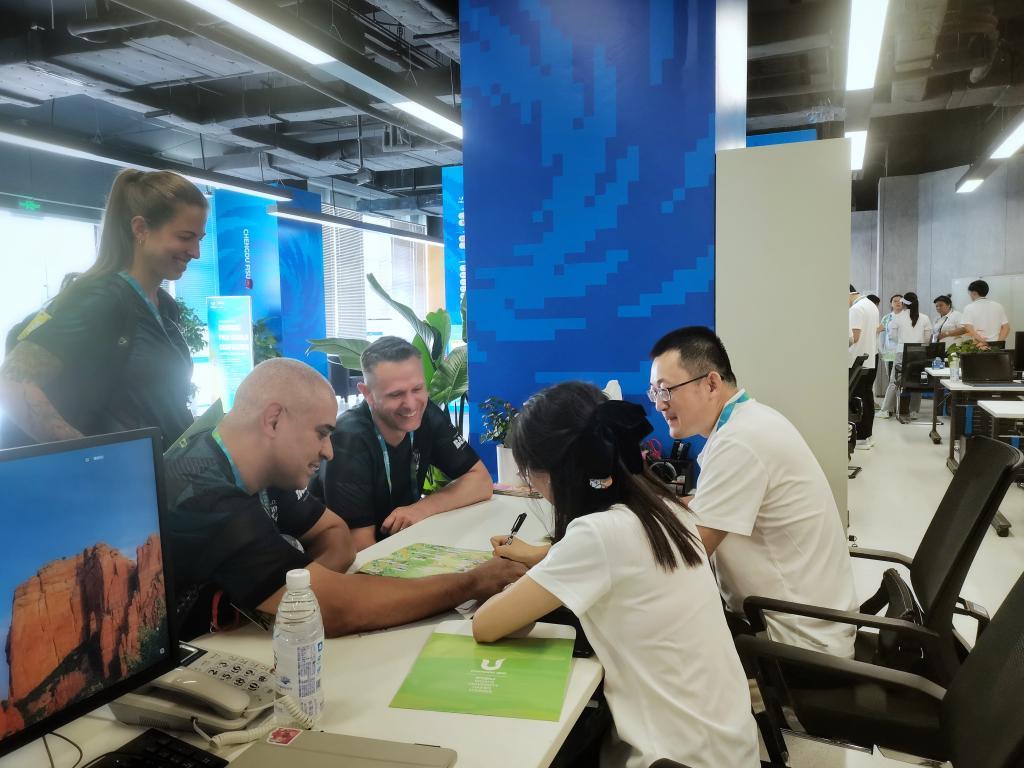 國外大學(xué)生代表團成員在成都大運村咨詢城市文化體驗觀光線路活動。受訪者供圖