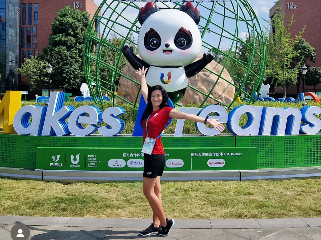 卡米拉·娜普洛斯塞克在成都大運村“蓉寶”雕塑前留影。圖片來自選手個人社交媒體頁面