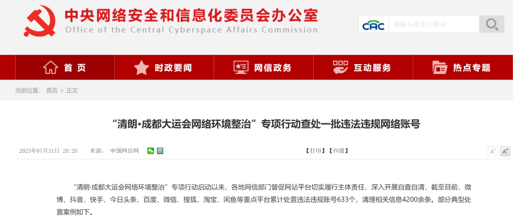 中央網(wǎng)信辦通報(bào)了部分典型處置案例,包括傳播大運(yùn)會謠言信息、利用“偽公益”惡意營銷炒作、假冒仿冒賬號發(fā)布信息、發(fā)布涉大運(yùn)會違規(guī)售賣信息等。