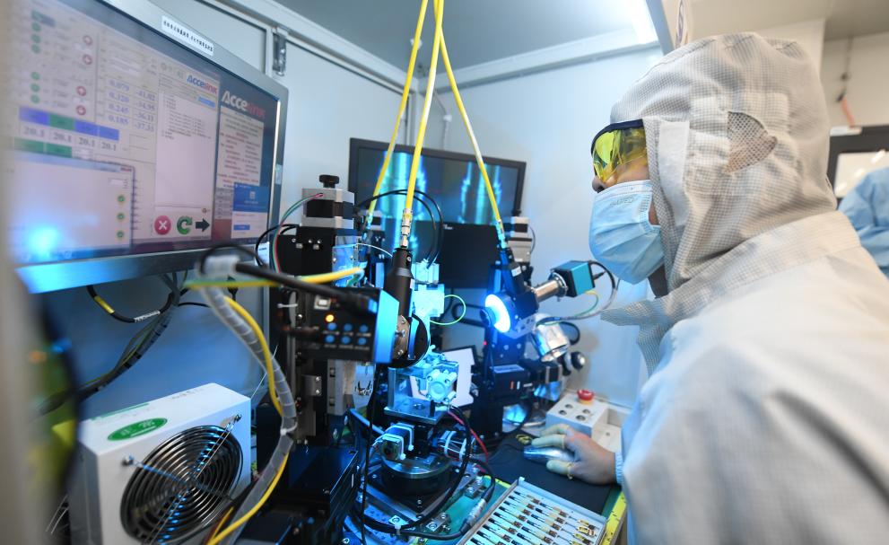 武漢光迅科技股份有限公司生產(chǎn)車間內(nèi),技術(shù)人員在光模塊生產(chǎn)線作業(yè)。新華社記者程敏 攝