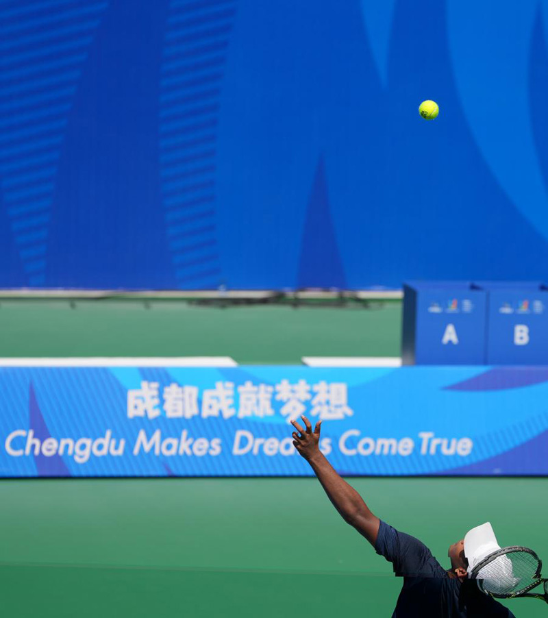 運(yùn)動(dòng)員在成都大運(yùn)會(huì)網(wǎng)球比賽中揮拍。新華社記者 李京 攝
