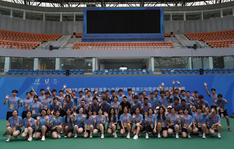 參與服務(wù)成都大運(yùn)會(huì)網(wǎng)球賽事的志愿者在此前的測(cè)試賽中合影留念