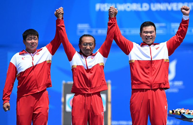7月30日,中國隊選手陳巖松、杜美余、王世坤(從左至右)在頒獎儀式上。當日,在成都舉行的第31屆世界大學生夏季運動會男子復合弓團體金牌賽中,中國隊以231環(huán):224環(huán)戰(zhàn)勝法國隊,獲得冠軍。新華社記者 張龍 攝