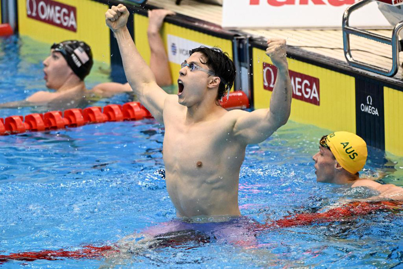 7月28日,覃海洋在決賽后慶祝。當(dāng)日,在日本福岡舉行的2023年世界游泳錦標(biāo)賽男子200米蛙泳決賽中,中國選手覃海洋以2分05秒48的成績奪冠,并打破該項(xiàng)目世界紀(jì)錄。新華社記者 許暢 攝