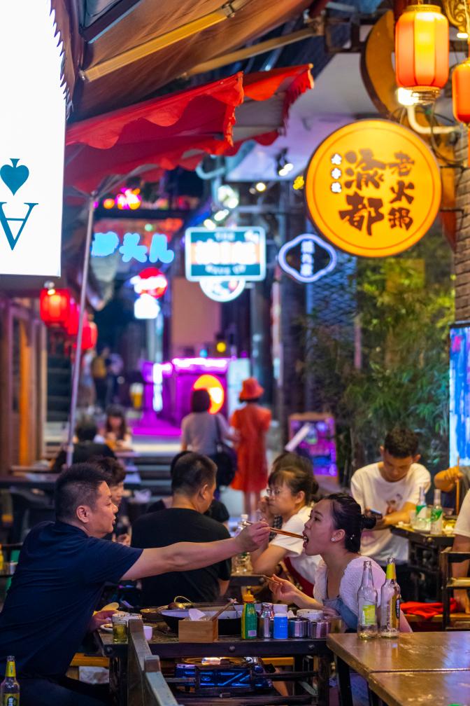 食客在成都猛追灣街道望平社區(qū)的美食一條街“香香巷”中吃火鍋(2021年7月1日攝)。新華社記者 沈伯韓 攝