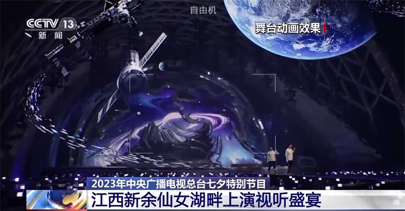 今年的七夕特別節(jié)目融入了傳統(tǒng)戲曲、民樂、非遺技藝等優(yōu)秀傳統(tǒng)文化元素,在歌曲《銀河逃離計(jì)劃》中,利用AR拍攝“太空旅行”,為觀眾構(gòu)建關(guān)于太空的可視化想象;在現(xiàn)場(chǎng)歌手與云端合唱《甜蜜蜜》中,借七夕節(jié)展現(xiàn)“一帶一路”中國(guó)同沿線國(guó)家建立浪漫深厚聯(lián)結(jié)的十周年。