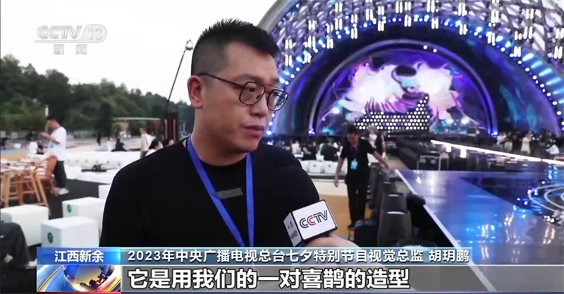 2023年中央廣播電視總臺(tái)七夕特別節(jié)目視覺總監(jiān) 胡玥鵬:整個(gè)主舞臺(tái)的LED屏,用一對(duì)喜鵲的造型來作為主造型,每個(gè)節(jié)目都要依據(jù)我們現(xiàn)在舞美的造型來做設(shè)計(jì)。同時(shí)我們?cè)O(shè)計(jì)了一個(gè)新媒體互動(dòng)裝置的樹,來作為整個(gè)舞臺(tái)的前景,它既承載著一個(gè)表演空間,又有很好的一個(gè)寓意。