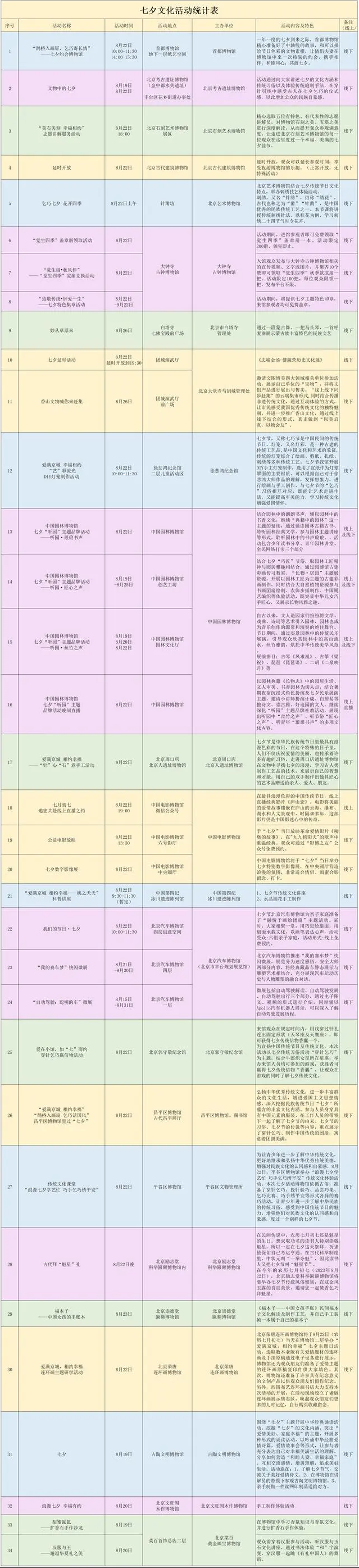 一些博物館將在七夕夜延時(shí)開(kāi)放。22日18時(shí),北京石刻藝術(shù)博物館里,5名志愿講解員將帶領(lǐng)觀眾深度游覽五塔寺,在一個(gè)個(gè)石刻文物故事中感受古寺和石刻藝術(shù)的魅力。北京古代建筑博物館當(dāng)晚延時(shí)開(kāi)放至20時(shí),觀眾可以領(lǐng)略七夕夜色中的古建筑之美。七夕還有“拜魁星”的習(xí)俗,22日晚,北京勵(lì)志堂科舉匾額博物館內(nèi)將舉辦一場(chǎng)七夕節(jié)傳統(tǒng)風(fēng)俗雅集,邀請(qǐng)觀眾賞良辰美景,乞巧拜魁星,在體驗(yàn)活動(dòng)中了解古代科舉文化。