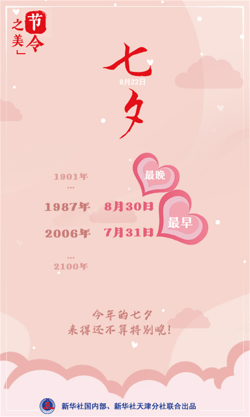 今年的七夕是來得最晚的嗎?不是!1901年至2100年這200年的統(tǒng)計結果顯示,七夕對應的公歷日期最早可落在7月31日(如2006年),最晚可落在8月30日(如1987年),這也意味著,公歷7月31日至8月30日中的任何一天都有可能成為七夕。照此來看,今年的七夕來得還不算特別晚。