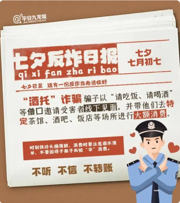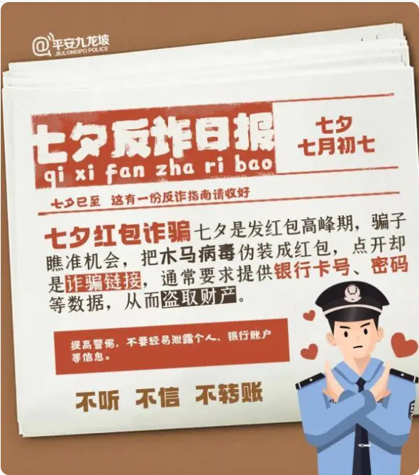 針對(duì)各類以“七夕”為幌子的詐騙手段,重慶市公安局九龍坡區(qū)分局也精心制作了一份反詐日?qǐng)?bào),提醒廣大群眾注意防范各類電信詐騙,勿將“七夕節(jié)”變成“七夕劫”。