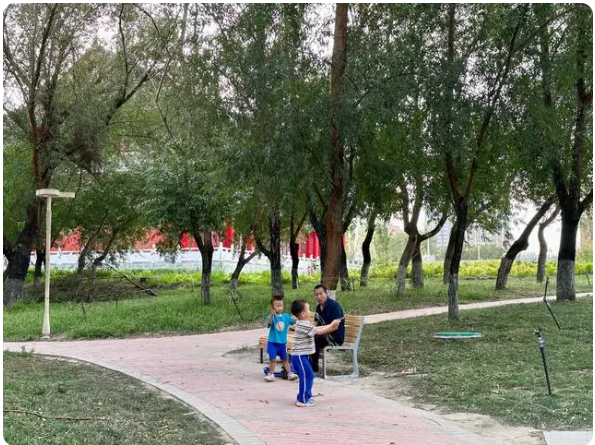 8月30日傍晚時分,記者來到新疆哈密市哈密河國家濕地公園。在其中的人民公園,樹木成蔭,水聲潺潺,涼爽宜人,不少市民正在鍛煉、休閑。