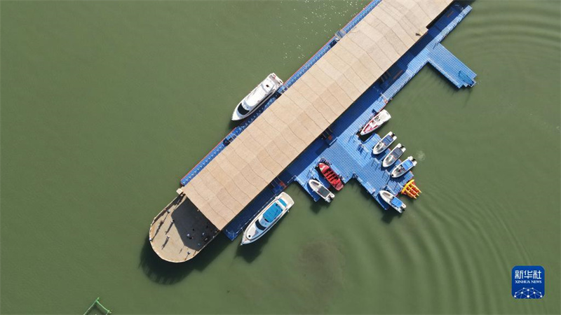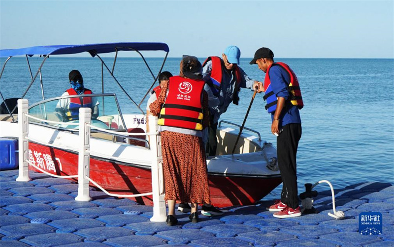 8月31日,在新疆博斯騰湖大河口景區(qū),工作人員幫助乘坐游艇的游客下船。