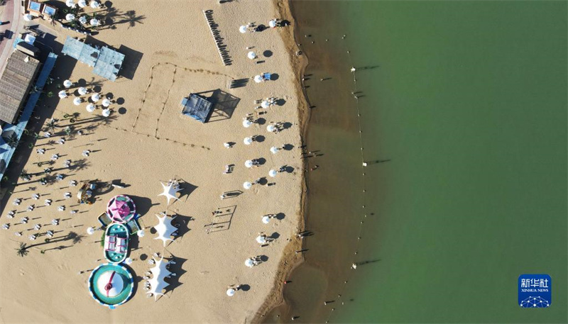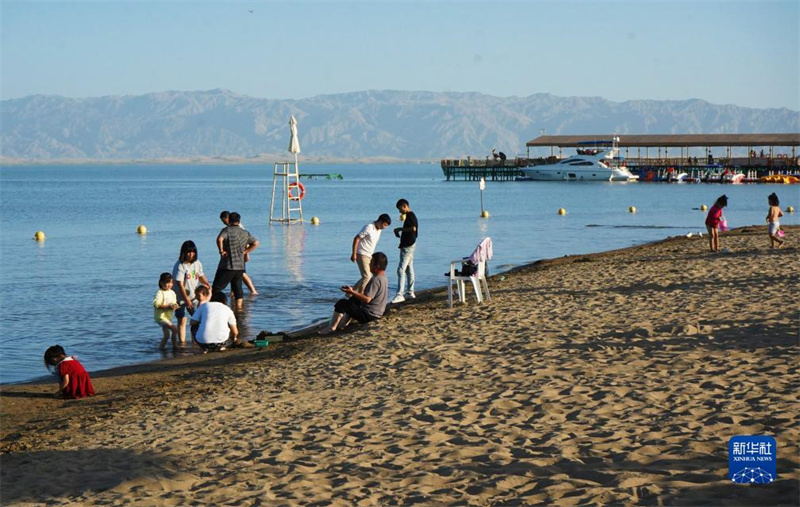 8月31日,游客在新疆博斯騰湖大河口景區(qū)游玩(無人機(jī)照片)。