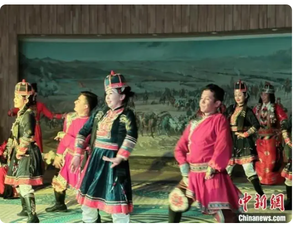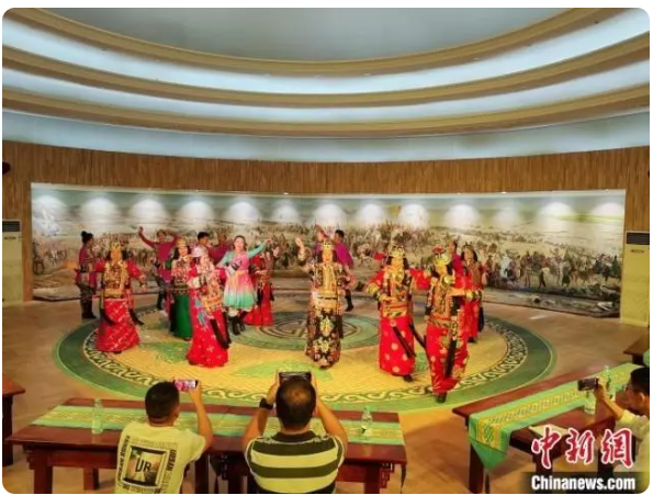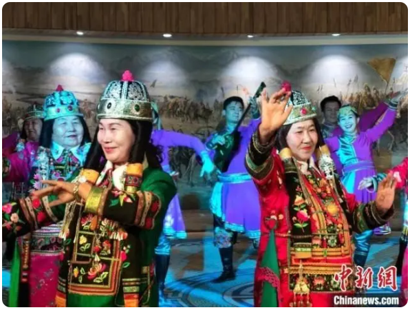 在博湖縣蒙古族非遺傳承保護(hù)中心,民間藝人們身穿華麗的民族服飾,伴隨著歡快的音樂,抖肩、彎腰、翻掌,表演薩吾爾登舞蹈,惟妙惟肖的舞姿、歡快強(qiáng)勁的節(jié)奏,為現(xiàn)場觀眾帶來了一場精彩絕倫的視覺盛宴。